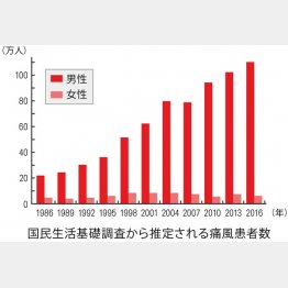 国民生活基礎調査(厚生労働省)によると、日本では痛風の患者数が年々増加し、推定100万人を突破した。ところが、尿酸値の高い人(尿酸値が7.0mg/dℓの状態)はその10倍の約1000万人を超えると推測されている。つまり、尿酸値が高くても9割は痛風発作を起こさず自覚症状がないため、どうしても日々のケアがおろそかになりがちなのだ。