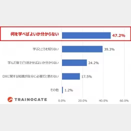 続けて「DXについて学びたいか」という質問には全体の86.6%が「学ぶ予定がない(学びたいと思っていない+学びたいと思っているが、学ぶ予定はない)」と回答し、その理由としては「何を学べばよいか分からない」(47.2%)「学ぶところを知らない」(39.3%)「学んだ後でどう活かせばよいか分からない」(24.2%)などが挙げられた。