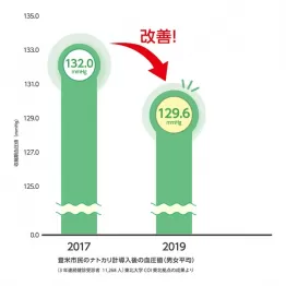 もともと登米市は脳血管疾患の死亡率が高く、高血圧対策が重要課題だった。ところが、こうした取組みの結果、登米市民の血圧値は東北大学東北メディカル・メガバンク機構とCOI東北の調べでは132.0mmHg(17年)→129.6 mmHg(19年) と改善されており、ナトカリバランスを意識した取り組みは血圧管理に役立つことが期待できる※4。