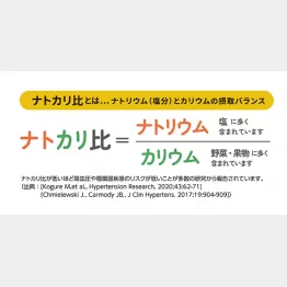 ナトカリバランスとは、ナトリウムとカリウムの摂取バランスを指し、ナトカリバランスを反映した指標がナトカリ比となる。ナトカリ比が低いほど高血圧のリスクが低くなることが明らかにされており、ナトカリ比は尿検査によって分かる。