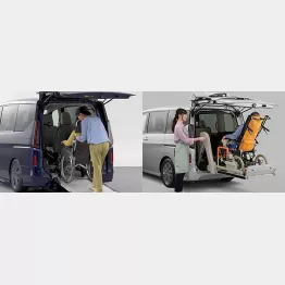◎スロープタイプ……車体後部に設置された緩やかなスロープを引き出せば車いすのまま介助者と一緒に乗り降りできる。