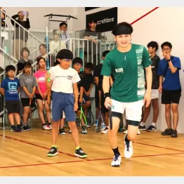 大会最終日には、最年少17歳3カ月での優勝を含む全日本選手権優勝8回の記録を誇る、日本スカッシュ界の第一人者・机龍之介選手(ダイナム所属=日本ランキング1位)による小中学生のジュニア選手を対象とした特別強化プログラム「龍之介チャレンジ2025」が開催され、参加した15人は机選手の一挙手一投足に目を輝かせていた。