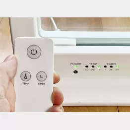 操作は付属のリモコンで行う。電源ボタンを押し、「TEMPボタン」を押すごとに3段階で設定温度が変わる。LOは約40度、MIDは約60度、HIは約80度で、いずれも放熱ガラス温度だ。低めの温度でも近くにいればじんわりと暖かみを感じる。