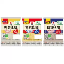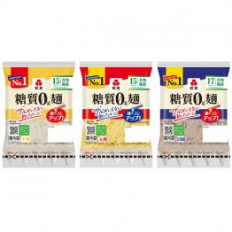 内容は、写真の「糖質0g麺(平麺/丸麺/そば風麺)」各156円(税込み)×各1点、「糖質0g麺 ごまだれぶっかけうどん風」216円(同)×1点、「糖質0g麺 ソース焼きそば風」216円(同)×1点、「糖質0g麺 ビビン麺風」216円(同)×1点の6種6品となる。