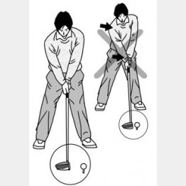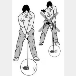 ダウンスイングで頭が左に動くのは「左足かかとの前に置いたボールに向かってクラブを振ってやろうとするために右肩も一緒に出ていってしまうためだ」とよくいわれる。