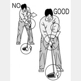 「アドレスしたとき、左手の人さし指と中指の2つのナックルが見えるぐらいがよい。左手をかぶせてグリップするときは左手首だけを右に回し、左ひじは外に向けないようにして下に向け、左わきもあけずに体につけて構える」(金井)