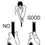 左ひじを下に向けたまま、左手首だけを右に回すようにしてグリップすれば左わきも体につけて構えることができる。その場合、左ひじを伸ばそうとしないで、杉原輝雄プロのように初めから少し曲げておけばフォロースルーで左ひじを逃がさずに、うまくたためるので球がよくつかまると教わった。ドライバーはアドレスしたとき、シャフトが目標線と直角になればフェースは目標にスクエア(直角)になるようにつくられている。そのためにはグリップエンドをヘッドより前(飛球方向)に出さないように手を内側に構える。