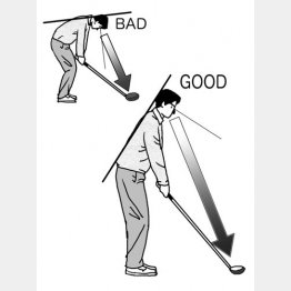 クラブがよく振れているときはごく自然に立って構えている人でも、ショットが悪くなるとうまく当てようという気持ちが強くなる。そうすると無意識のうちにボールに顔を近づけたくなり、だんだん前かがみになっていることが多いようだ。