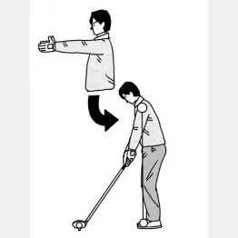 左のつま先を開いて構えるとオープン気味のスタンスになるので、右足を少し後ろに下げて構えると左サイドがしっかりするというのだ。ただし、左かかとの前に置いたボールを真正面から見ようとすると右肩が前に出て、上体が開いて構えていることがある。それを防ぐには両肩にクラブをあてがって目標線と平行になるようにしたい。
