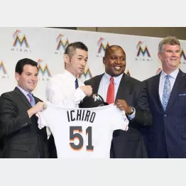 29日、マーリンズは都内ホテルで1年総額200万ドル(約2億4000万円)で契約したイチローの入団を発表。会見にはマーリンズからサムソン球団社長のほか、ダン・ジェニングスGM、マイケル・ヒル編成本部長の3人が同席した。