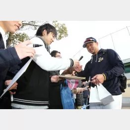 愛想よくペンを受け取っているのは、オリックスの新戦力・中島裕之だ。 練習が終わると、球場横にある選手用の通路で70人以上ものファンに一人残らずサイン。キャンプ初日は100人以上の列をさばいた。中島は2ショット写真の要望にも気軽に応じ、「西武時代からの中島ファン」という人たちは大喜び。 昨季、ソフトバンクと優勝争いを繰り広げたオリックスは、170万3734人を動員。前年比18.4%増となり、パで最高の伸び率だった。今季はナカジの加入で、来場者はさらに増えるか。
