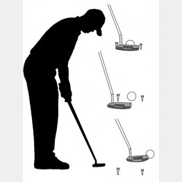 やり方は簡単。アドレスしてグリーン上にヘッドを置いたら、パターヘッドのトウとヒールの外側にティーペッグを1本ずつ刺す。