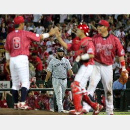 スタンドもマウンド上も歓喜に沸く中、ひとり肩を落としてベンチに引き揚げているのは阪神の主砲ゴメス。26日、マツダスタジアムで行われた広島―阪神戦が終了した直後のひとコマだ。