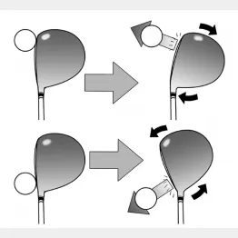 打点位置もボールが飛び出す方向に強い影響を与える。例えば、フェースが真っすぐな状態でも、打点位置がヒール側にズレると、インパクトの衝撃でヘッドは反時計回りに回転してボールは左に飛び出す。