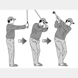 アドレスしたら「前にならえ」するような感じで腕を真上に上げ、そこから肩を回してトップをつくっている。