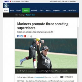 ソフトボールを投げている美女は今回、マリナーズのスカウトとして正式採用されたアマンダ・ホプキンスさん(22)。ホームページに掲載された写真(マリナーズオフィシャルサイトから)で、メジャーの女性スカウトは1950年代以来になる。