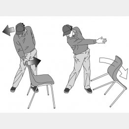 イラストを見ていただきたい。椅子のすぐ後ろに立ったら、インパクトの形をつくって右手を椅子の背もたれにあてがう。これで準備完了。