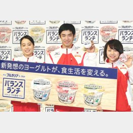 6日、都内で行われた「明治ブルガリアヨーグルト」の新商品発表会に女子日本代表の村上茉愛(20)、笹田夏実(21=いずれも日体大)とともに出席。
