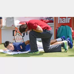 トレーナーから左でん部付近のマッサージを受け、苦悶の表情を浮かべているのは男子テニスの錦織圭(27)。22日、ドイツで行われているゲリー・ウェバー・オープン2回戦の試合中のシーンだ。