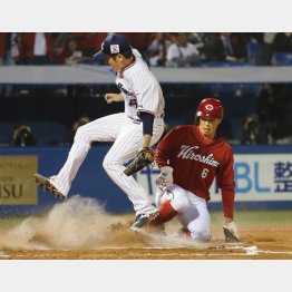 1点リードの六回。1死一、二塁の場面で西川の一ゴロを、坂口が悪送球。ボールが転々とする間に、まず二走の丸が生還して同点。ボールを拾った捕手の中村がホームへ投げるも、三塁手・川端のカバーが遅れ、一走の安部までホームイン。ヤクルトは2つのミスで逆転を許した。
