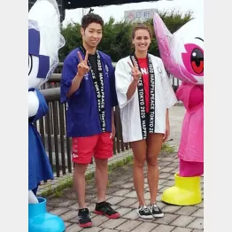 7日、20年東京五輪の競泳などの会場となる建設中の「オリンピックアクアティクスセンター」を視察し、リオ五輪女子100メートル背泳ぎ銅メダルのカイリー・マス(22=カナダ)と並んで記念撮影した際の1コマ。