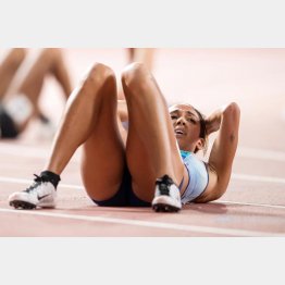 トラックにあおむけになっているのは七種競技のカタリーナ・ジョンソン・トンプソン(26・英国)。