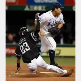 西武1点リードの八回、代打長谷川勇の適時打で同点にされると、その直後、中継ぎ・平良の変化球を捕手の森が後逸。森は慌ててボールを拾ったものの、その隙に俊足で鳴らす三塁走者の周東がホームに滑り込んだ。