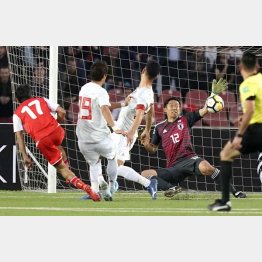 FW鎌田が相手エリアでボールをロスト。一気のカウンターで日本DF陣がもたつき、相手MFに至近距離からシュートを放たれた。が、権田は落ち着いていた。ギリギリまで相手MFの動きを見て、シュートの軌道を確認してから左手一本でファインセーブである。
