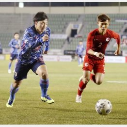 香港のパーテライネン監督は、日本の初戦となった中国戦で先制ゴールを決めたMF鈴木武蔵とドリブル突破でチャンスメイクした左MF森島司の2シャドー(香港戦は右がFW仲川輝人、左がFW田川亨介だった)を警戒し、トリプルボランチの両サイドの選手を2人のマンマーカーに起用した。