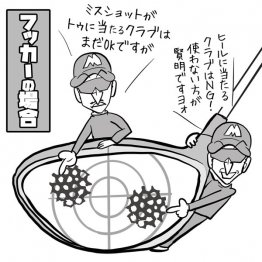 もう1つはミスショット時の打点位置。右から左に曲がるフッカーの場合は、ミスショット時に打点位置がフェースのトウ側にあるクラブは相性がよろしい。対して、ミスショット時に打点がヒール側になりやすいクラブは手を出すべきではありません。