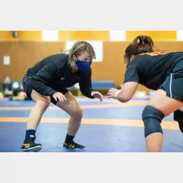 21日、女子レスリング日本代表が都内で、12月の世界選手権(ベオグラード)に向けた合宿を開始。新型コロナウイルス感染防止、心肺機能強化を目的にマスク着用でスパーリングなどをこなした。
