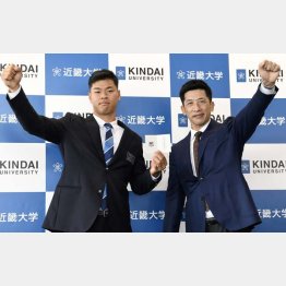 阪神は27日、4球団の1位指名競合の末、交渉権を獲得した近大の佐藤輝明(仁川学院)に指名挨拶。矢野監督は、佐藤本人が目標に掲げるトリプルスリー(3割、30本、30盗塁)の上を行く、日本プロ野球界では前人未到の40本塁打、40盗塁達成に期待を寄せた。