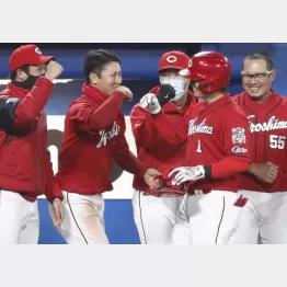 この日はスタメン1番で出場。初回と二回は奥川から中堅二塁打と左前打を放つと、三回は2番手の星から右翼への適時二塁打。はかったように3打数3安打、打率・300になったところで代走を送られ、ベンチに戻るなりナインから祝福された。