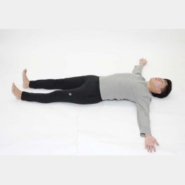 座布団の上にあおむけに寝ます。座布団は、後頭部あたりから背骨に沿わせます。両手と両足はリラックスした状態で伸ばします。その際、手のひらを上向きにしてください。そして、30秒間、その状態をキープします。このストレッチにより、胸郭(胸の骨格)を開いて可動域を確保することで、猫背などの姿勢の改善につながります。