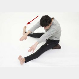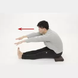 背筋を伸ばして四つ折りにした座布団(厚めの方がより良い)の上に座り、両足を揃えた状態で前に伸ばします。爪先は真上に。そうすることで、自然と体が前屈した状態になります。ゆっくりと息をフゥーッと吐きながら、爪先方向へ体を倒します。次に足を開き、左右へ10回ずつ。計30回が目安です。