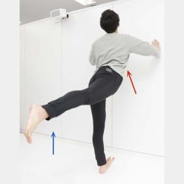 壁に手が届くくらい(1メートルほど前)の位置で正面を向いて両手を壁で支えます。片方の足を背筋を伸ばした状態をキープしながら、骨盤が地面と平行になるまで足を後ろに上げ、そして下ろします。足を上げた姿を横から見ると、Tの字をつくるイメージです。支えている方の足もできるだけ膝を曲げずにガマンしましょう。