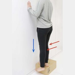 10~15センチくらいの高さの踏み台(なければ、不用になった新聞や雑誌を束ねたものなど)を用意し、壁の前に置きます。床の間や階段などの段差を利用しても構いません。