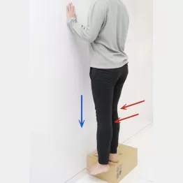台の上に片足だけで立ちます。左右どちらの足で立っても構いません。体が倒れないように、両手を前の壁などで支えてください。