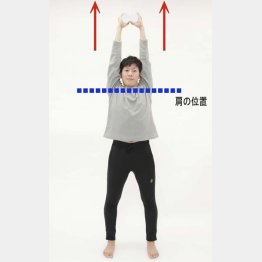 1本ずつ両手に持ち、足を肩幅に開いて立ちます。腕を真っすぐ伸ばした状態で、バンザイをするように両手を真上に上げます。この際、背筋を伸ばして真っすぐ立ち、肩の位置が前や後ろに倒れていないか、チェックしましょう。10回が目安です。もしペットボトルが重たく感じる場合は、持たなくても大丈夫です。