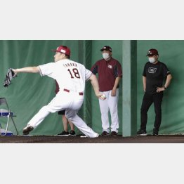 この日の田中は、小山投手コーチが左右の打席に入るだけでなく、走者を想定してセットポジションも試すなど、実戦的な投球練習を行った。