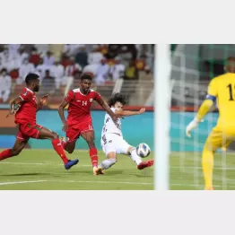 積極果敢なドリブル突破が三笘の真骨頂。後半開始早々、持ち場である左サイドから仕掛けてオマーン選手のファウルを誘発。このワンプレーがチームを波に乗せた。