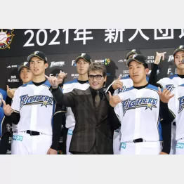 日本ハムが5日、新球場を建設中の北海道北広島市内で行った新入団選手記者発表会見。茶色と黒のチェック柄のスーツにゴールドのネクタイ姿で出席した新庄剛志監督(49)は、「楽しむことを苦労と思わず、楽しんで」「つまらない練習を毎日積み重ねて、それが大きく花咲く」「ファンに愛される選手になるために、自分がファンを愛すこと」。