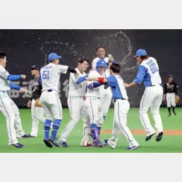 サヨナラ打の宇佐見真吾(28)目掛けて、選手が次々とペットボトルの水を浴びせる。試合後の日本ハムナインは、ハチの巣をつついたかのような騒ぎ方だった。