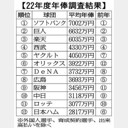 16日、日本プロ野球選手会は今季の12球団日本人選手の平均年俸を発表(表参照)。日本ハムの2817万円は12球団最下位。1位ソフトバンクは7002万円で、その差は4185万円。この差額は5位のヤクルトとほぼ同額だ。
