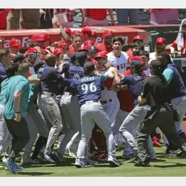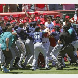 この日は二回、マリナーズの先頭打者ウィンカーへの死球から両軍が入り乱れる大乱闘に発展。エンゼルス・ネビン監督代行、マリナーズ・サービス監督を含む計8人が退場になった。大谷も水原通訳とともに遠巻きに加わり、時折、大声を発しながら相手選手を止める場面も見られた。