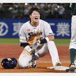 歓声がため息に変わる中、全力疾走の村上が一塁へヘッドスライディング。これが再び相手の悪送球を誘い、一挙3得点で試合をひっくり返したのだが、頭からベースにダイブしたままの村上はチームの逆転に気が付かない。球場とベンチの歓声でようやく顔を上げ、やっと事態をのみ込んだ泥だらけの村上はベース上で大爆笑。その姿にベンチの高津監督もナインも大笑いと相成った。