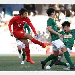 この日(4日)の青森山田戦では序盤から攻守にハードワーク。ひざ下の高さのクロスにダイビングヘッドを試みたり、DF2人を背負って強引にシュートに持ち込んだり、随所に<師王>らしさ全開。