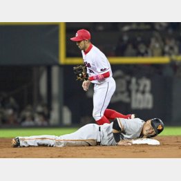 二回1死一塁から好調の打撃で左中間を破ったまでは良かった。しかし、一塁走者の岡本和が三塁でストップしているのを確認せず、猛然と二塁を回った。岡本和は押し出される形で本塁にスタートを切ってアウト。しかも、悲劇はこれで終わらなかった。