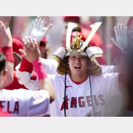 二刀流による一発にファンもベンチも大喜び。ベンチに戻ると今季、本塁打を放った選手がかぶるかぶとを初めて着用してナインと笑顔でハイタッチ。同僚選手による祝福はしばらく続き、大谷から笑みが絶えることはなかった。