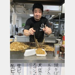 「秘訣は自家製のソース。5種類をブレンドしているんです。麺も71年前の創業時からずっと地元の老舗のものを使っている。おかげさまで注文がどんどん入るから、常に焼きたてを提供できておいしいんですよ」と3代目オーナー(写真)。具は豚肉とキャベツ、そして店の鍋で揚げた天かす。「いろいろな天ぷらの味が混ざっているからうまいですよ」と胸を張った。